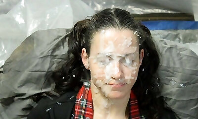 Horny sweetheart gets jizz geyser on her face swallowing all the j