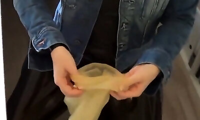 Joyful towheaded girl Violette Pink pushes inflated rubber gloves in her pussy